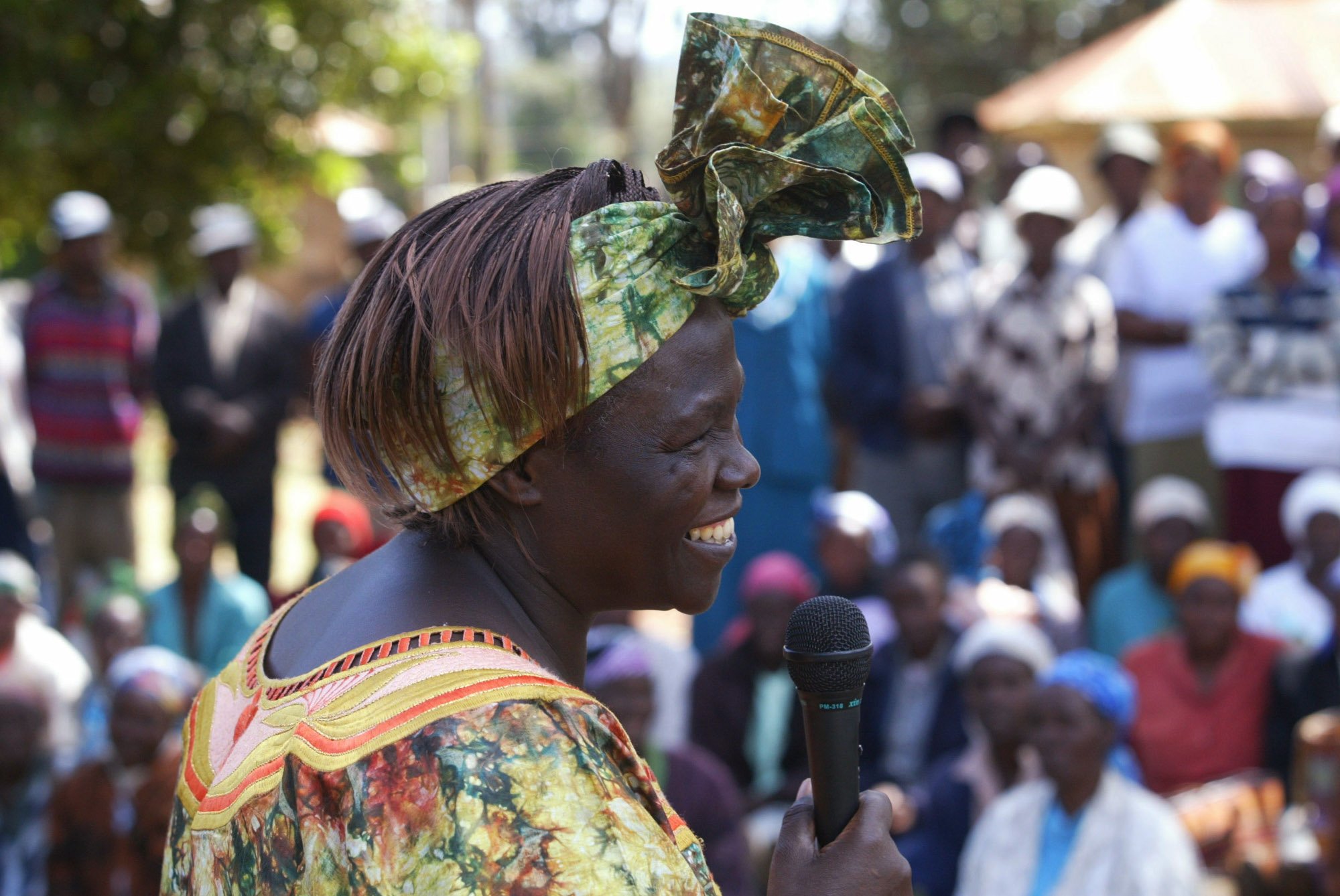 Kenyan environmental activist Wangari Maathai adress people, Friday, Oct 8, 2004 in Ihururu near Nyeri after she won the Nobel Peace Prize on Friday for her work as leader of the Green Belt Movement, which has sought to empower women, better the environment and fight corruption in Africa for almost 30 years.